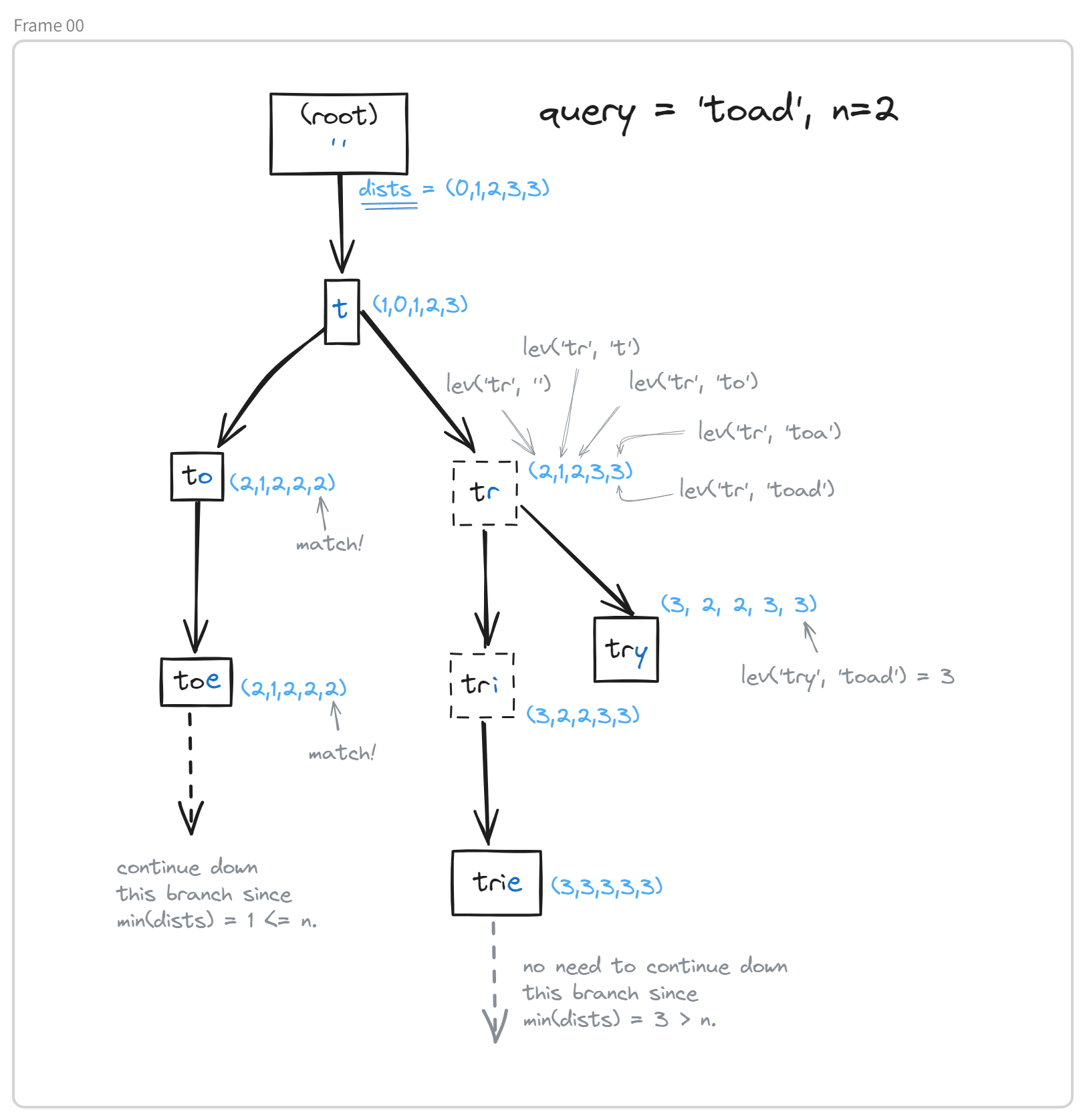 distsvector allows for both (1) determining the Levenshtein distance between the query and the current word, and (2) checking whether or not descendants of the current node could potentially match. So we’re both effieciently computing the Levenshtein distance and only exploring relevant branches of the trie.